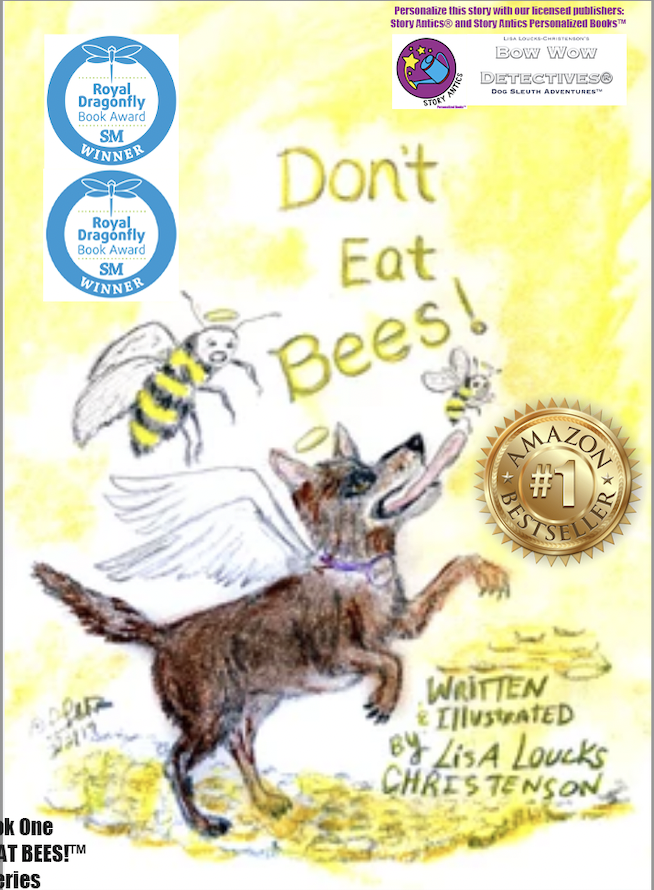 Lisa Loucks-Christenson's DON'T EAT BEES!™ Series is published by Bow Wow Detectives® DON'T EAT BEES! is licensed to Story Antics® personalized and published by the Story Antics Personalized Books™ division featuring our new customers and established clients' dogs that match names in our names database. Further customizations are available to the story but only available time basis. Simply call us to discuss your idea. |